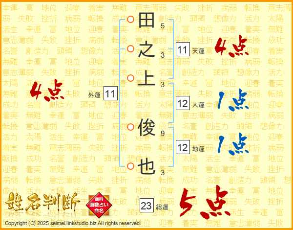 田(5画)之(3画)上(3画) 俊(9画)也(3画)