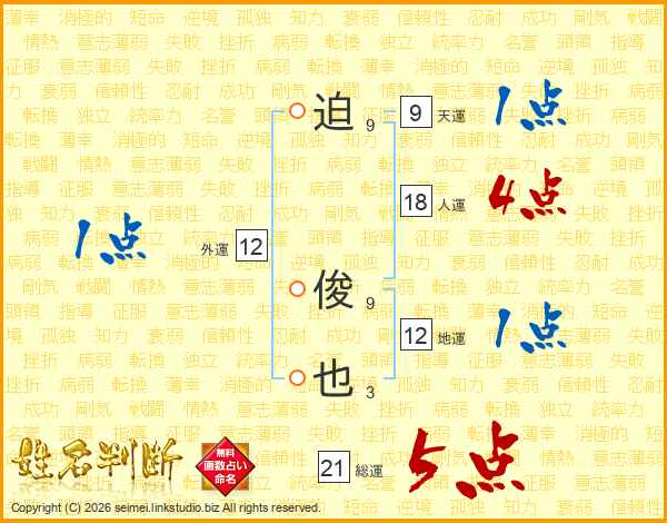 迫俊也さんの総運は21画の5点!