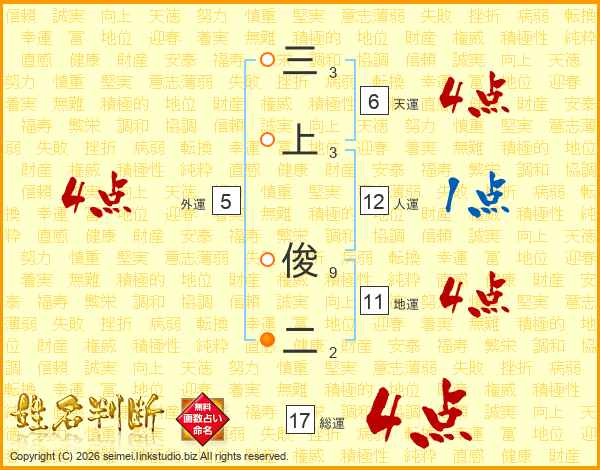 生活面を象徴する運勢です。外部から受ける影響力を表し、結婚運、家庭運や職場、環境への順応性を表します。総運から人運を引いた画数。姓や名が1文字の場合を除く。