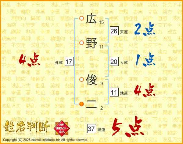 生活面を象徴する運勢です。外部から受ける影響力を表し、結婚運、家庭運や職場、環境への順応性を表します。総運から人運を引いた画数。姓や名が1文字の場合を除く。