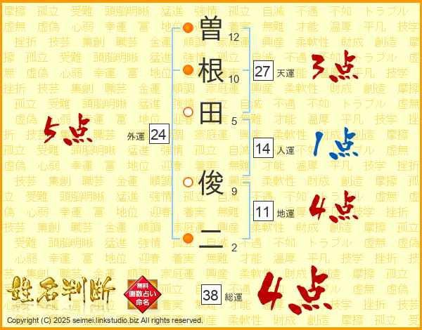 曽(12画)根(10画)田(5画) 俊(9画)二(2画)