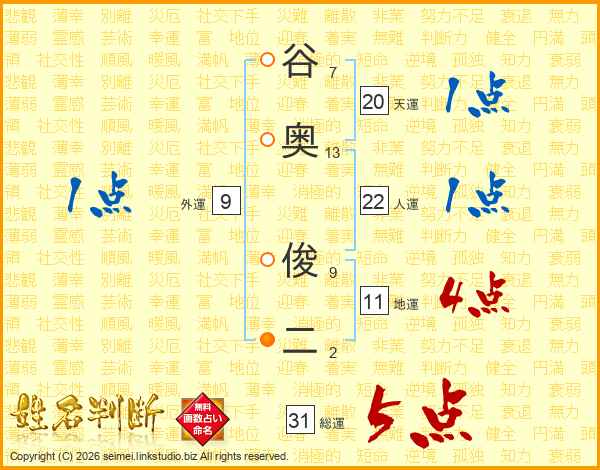 谷(7画)奥(13画) 俊(9画)二(2画)