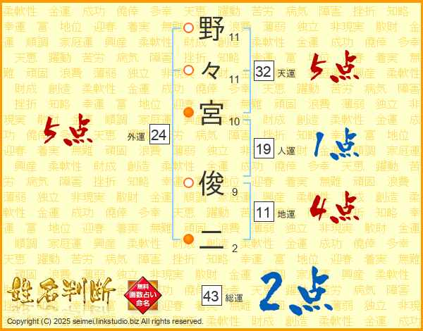 野(11画)々(11画)宮(10画) 俊(9画)二(2画)