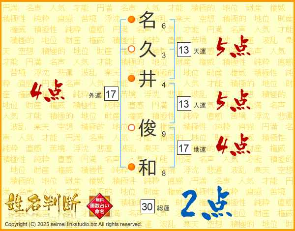 名(6画)久(3画)井(4画) 俊(9画)和(8画)