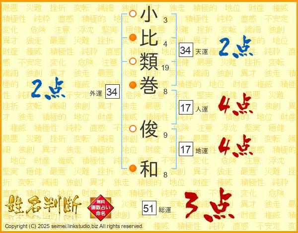 小(3画)比(4画)類(19画)巻(8画) 俊(9画)和(8画)