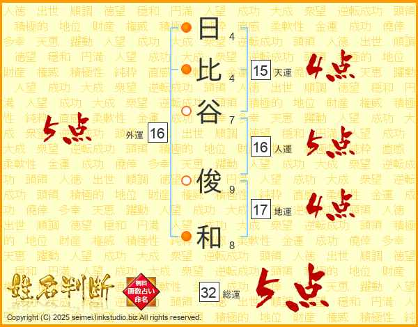 日(4画)比(4画)谷(7画) 俊(9画)和(8画)