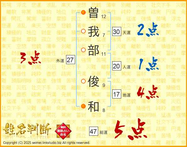 曽(12画)我(7画)部(11画) 俊(9画)和(8画)
