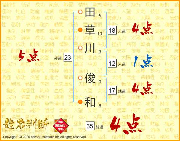 田(5画)草(10画)川(3画) 俊(9画)和(8画)