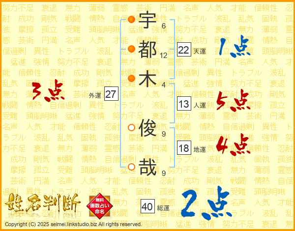 宇(6画)都(12画)木(4画) 俊(9画)哉(9画)