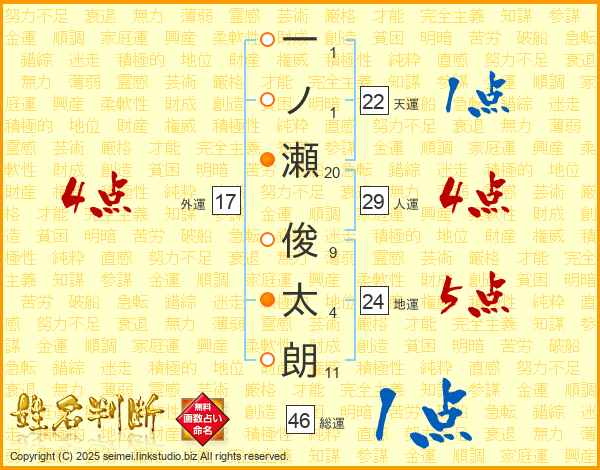 一ノ瀬俊太朗さんの総運は46画の1点!
