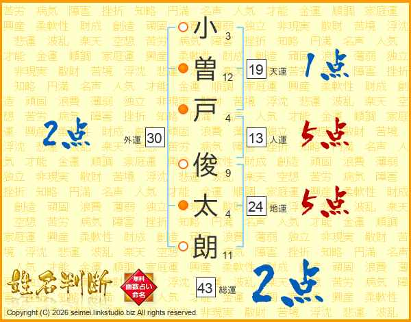 小(3画)曽(12画)戸(4画) 俊(9画)太(4画)朗(11画)