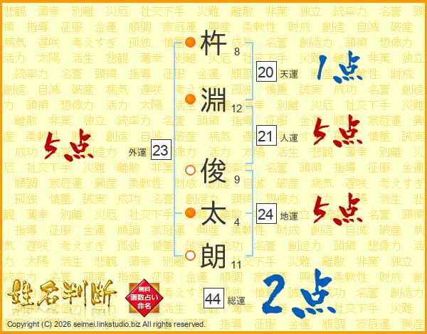 杵(8画)淵(12画) 俊(9画)太(4画)朗(11画)