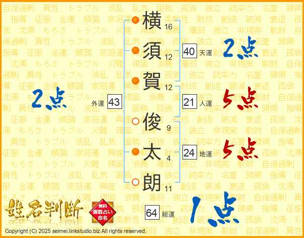 横(16画)須(12画)賀(12画) 俊(9画)太(4画)朗(11画)