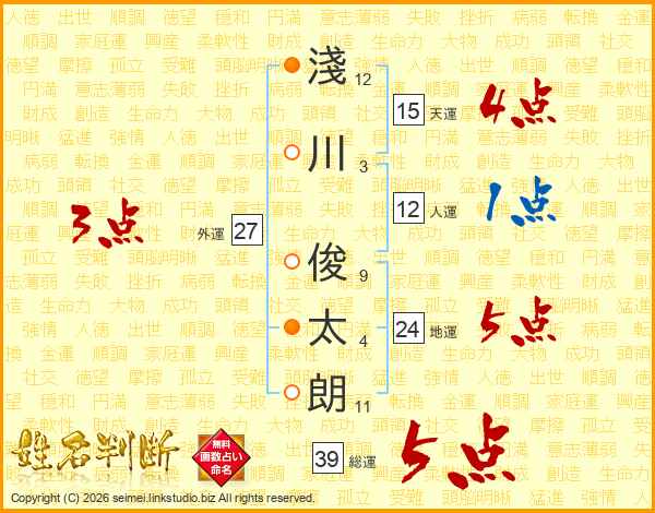 淺川俊太朗さんの総運は39画の5点!