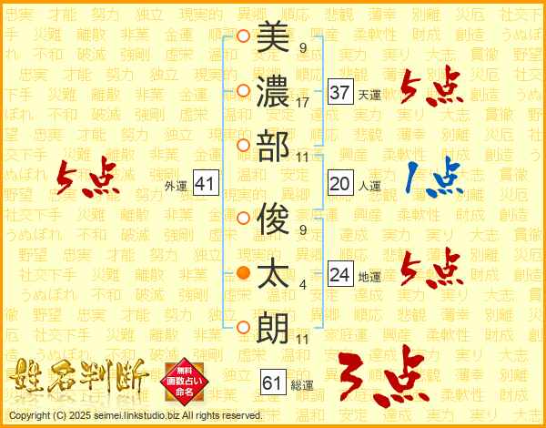 美(9画)濃(17画)部(11画) 俊(9画)太(4画)朗(11画)