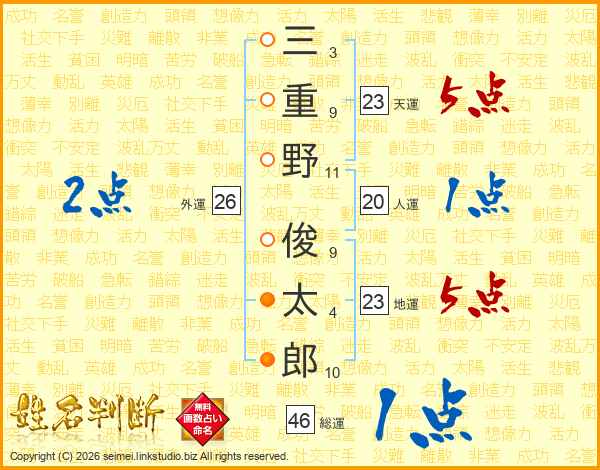 三(3画)重(9画)野(11画) 俊(9画)太(4画)郎(10画)