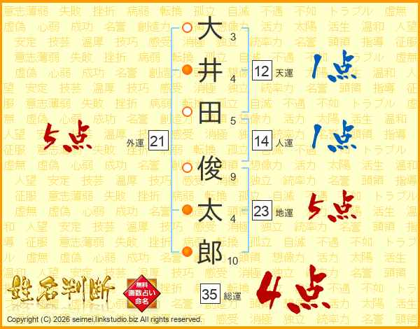 大(3画)井(4画)田(5画) 俊(9画)太(4画)郎(10画)