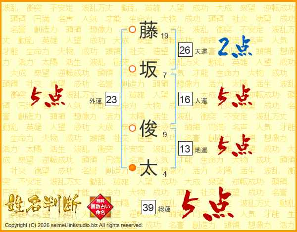 藤(19画)坂(7画) 俊(9画)太(4画)