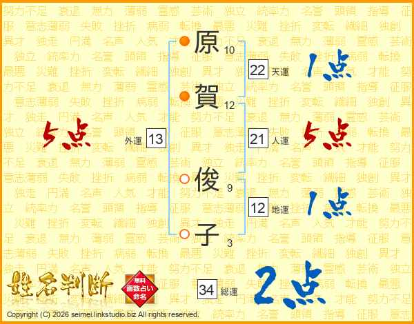 原賀俊子さんの人運は21画の5点!