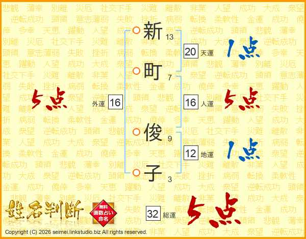 生活面を象徴する運勢です。外部から受ける影響力を表し、結婚運、家庭運や職場、環境への順応性を表します。総運から人運を引いた画数。姓や名が1文字の場合を除く。