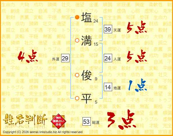 塩(24画)満(15画) 俊(9画)平(5画)