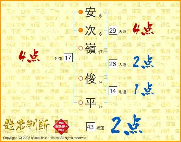 安(6画)次(6画)嶺(17画) 俊(9画)平(5画)