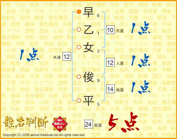早乙女俊平さんの総運は24画の5点!