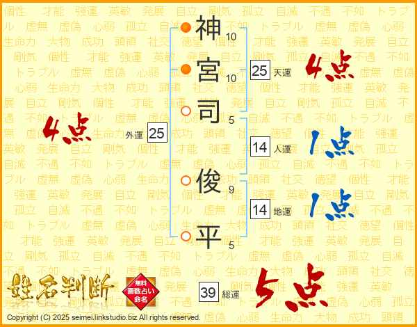 神(10画)宮(10画)司(5画) 俊(9画)平(5画)