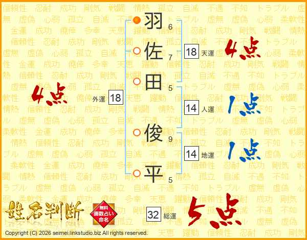 羽(6画)佐(7画)田(5画) 俊(9画)平(5画)