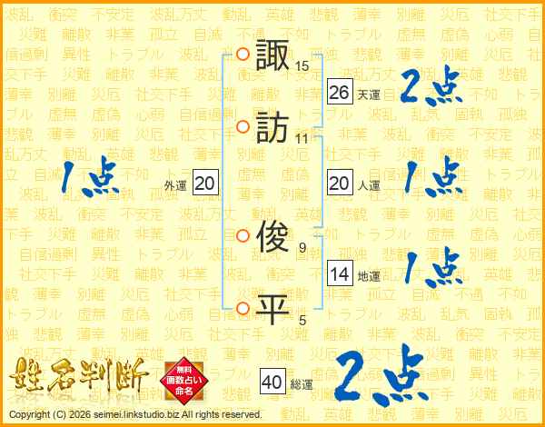 諏(15画)訪(11画) 俊(9画)平(5画)