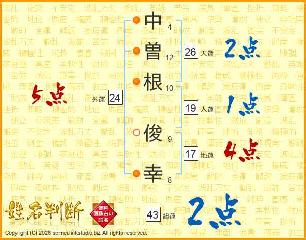 中(4画)曽(12画)根(10画) 俊(9画)幸(8画)