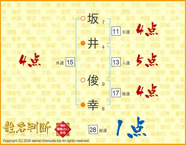 坂(7画)井(4画) 俊(9画)幸(8画)