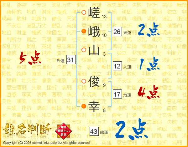 嵯(13画)峨(10画)山(3画) 俊(9画)幸(8画)