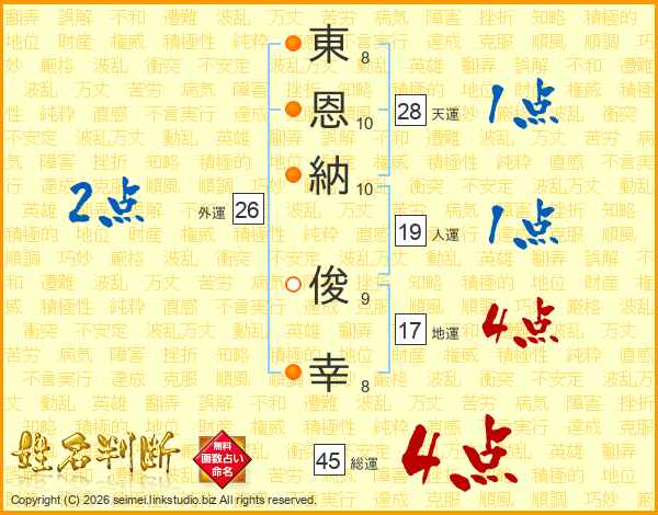 東(8画)恩(10画)納(10画) 俊(9画)幸(8画)