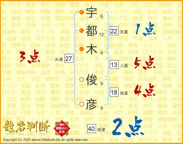 宇(6画)都(12画)木(4画) 俊(9画)彦(9画)