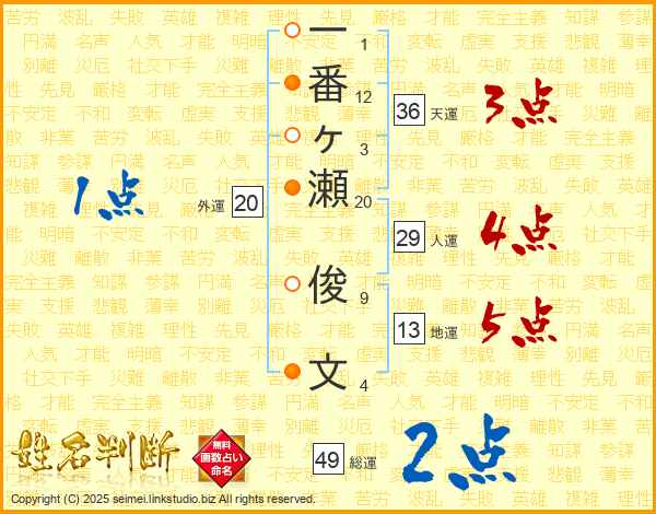 一番ヶ瀬俊文さんの天運は36画の3点!