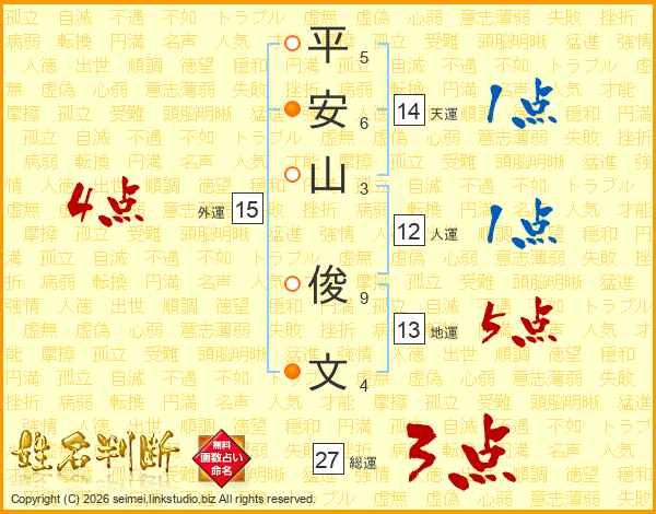 平(5画)安(6画)山(3画) 俊(9画)文(4画)
