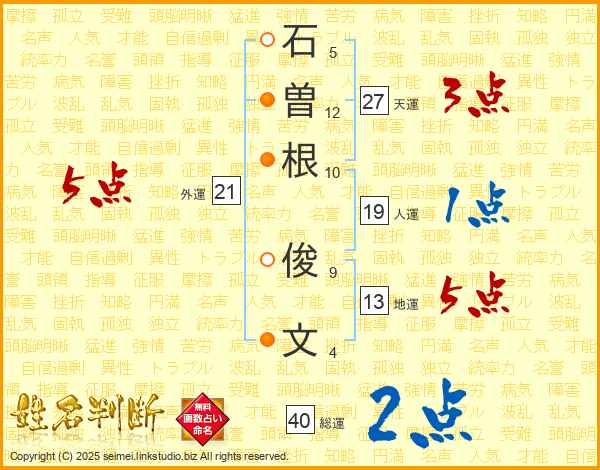 石(5画)曽(12画)根(10画) 俊(9画)文(4画)