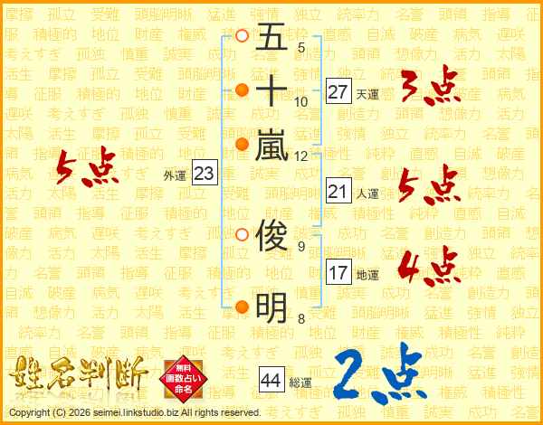 五(5画)十(10画)嵐(12画) 俊(9画)明(8画)