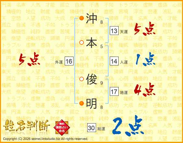 あなたの人生を表す1番重要な運勢です。生涯を通じて影響する総合運となり、主に50歳以降の晩年期に影響を及ぼします。苗字と名前の合計画数。