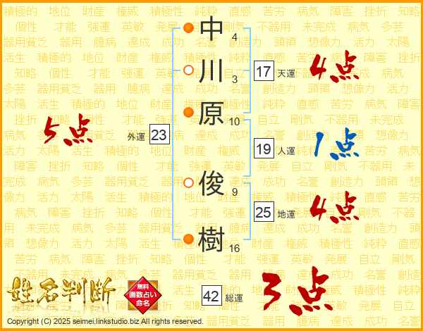中(4画)川(3画)原(10画) 俊(9画)樹(16画)