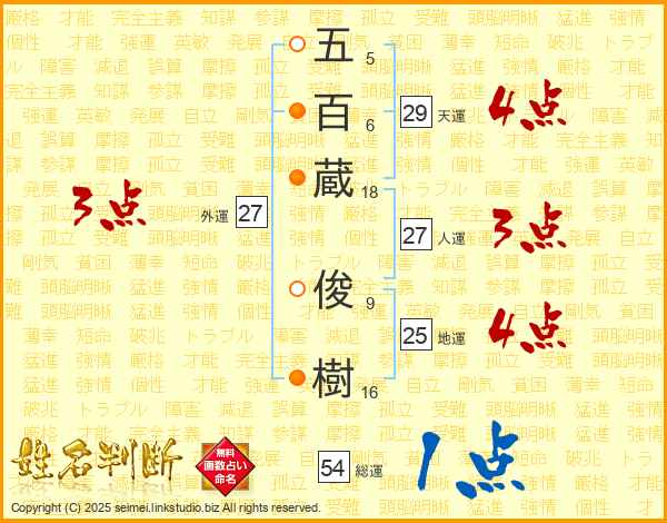 五(5画)百(6画)蔵(18画) 俊(9画)樹(16画)