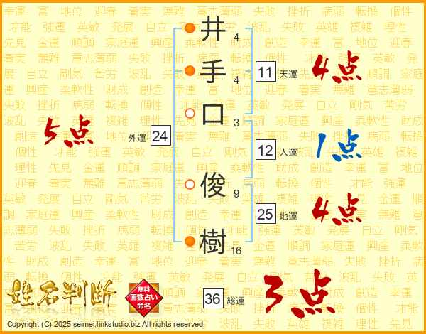 井(4画)手(4画)口(3画) 俊(9画)樹(16画)
