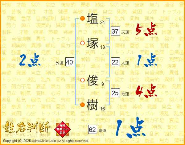 塩(24画)塚(13画) 俊(9画)樹(16画)