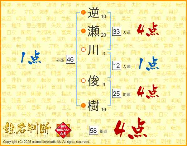 逆(10画)瀬(20画)川(3画) 俊(9画)樹(16画)