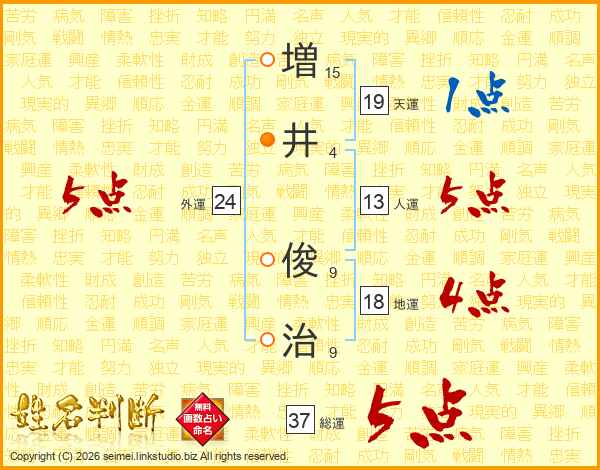 生活面を象徴する運勢です。外部から受ける影響力を表し、結婚運、家庭運や職場、環境への順応性を表します。総運から人運を引いた画数。姓や名が1文字の場合を除く。