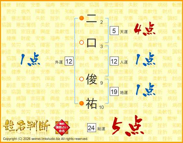 あなたの人生を表す1番重要な運勢です。生涯を通じて影響する総合運となり、主に50歳以降の晩年期に影響を及ぼします。苗字と名前の合計画数。
