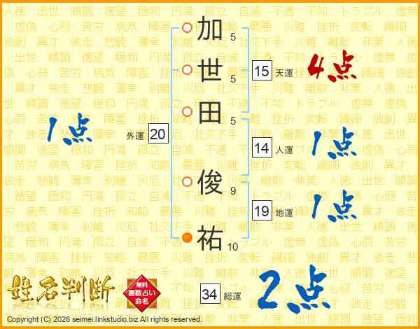 加(5画)世(5画)田(5画) 俊(9画)祐(10画)