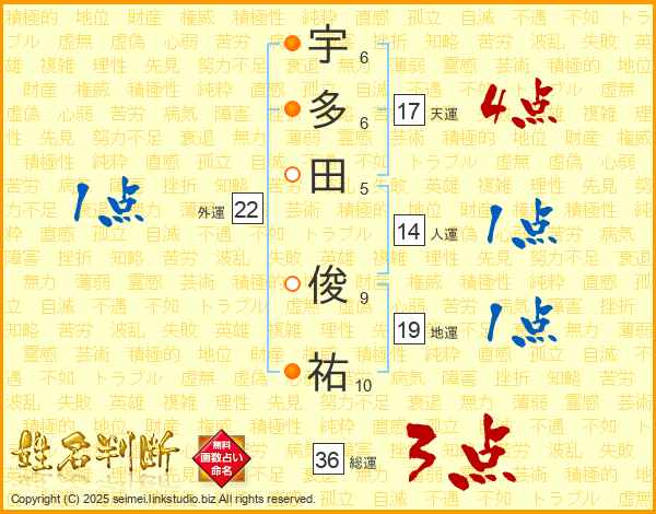 宇(6画)多(6画)田(5画) 俊(9画)祐(10画)