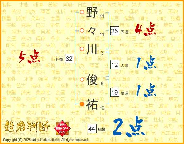 野(11画)々(11画)川(3画) 俊(9画)祐(10画)